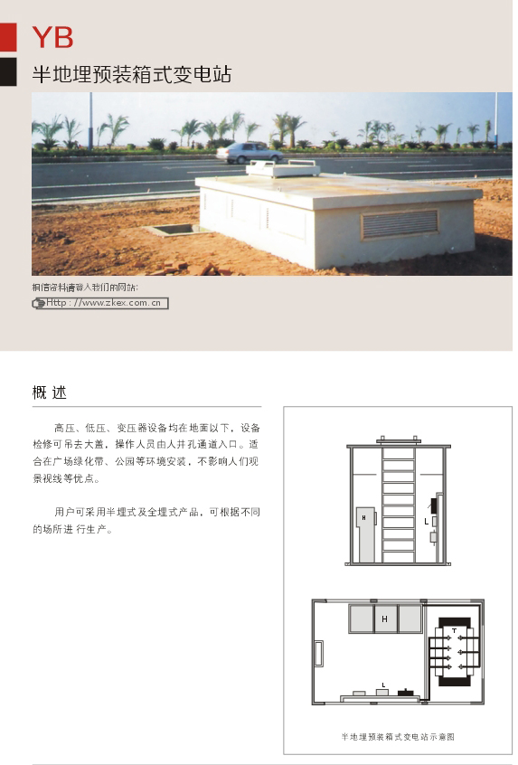 高壓、低壓、變壓器設(shè)備均在地面以下,設(shè)備檢修可吊去大蓋,操作人員由人井孔通道入口。適合在廣場綠化帶、公園等環(huán)境安裝,不影響人們觀景視線等優(yōu)點(diǎn)。用戶可采用半埋式及全埋式產(chǎn)品,可根據(jù)不同的場所進(jìn)行生產(chǎn)。