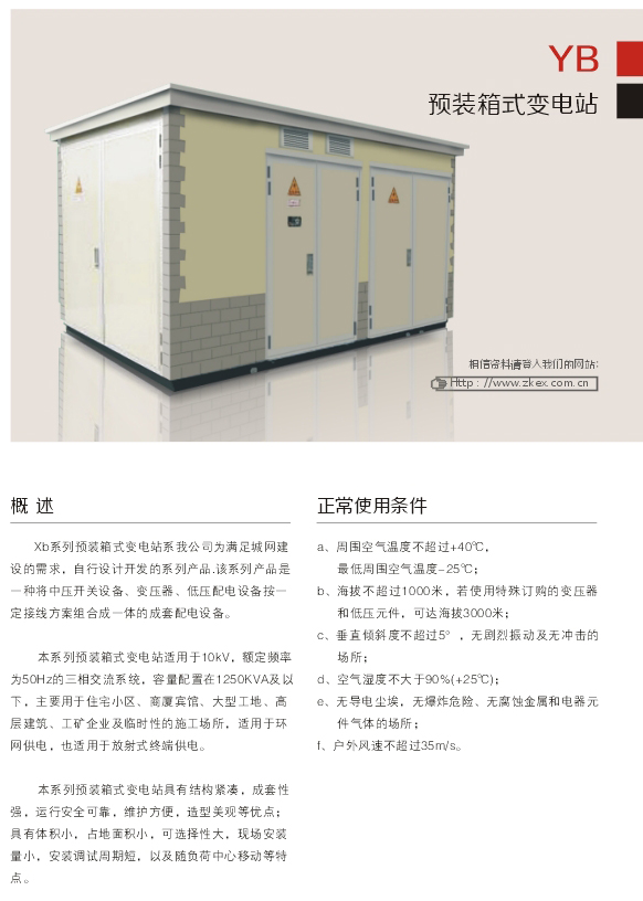 Xb系列預裝式箱式變電站系我公司為滿足城網建 設的需求,自行設計開發的系列產品.該系列產品是. 一種將中壓開關設備、變壓器、低壓配電設備按一 定接線方案組合成一體的成套配電設備。