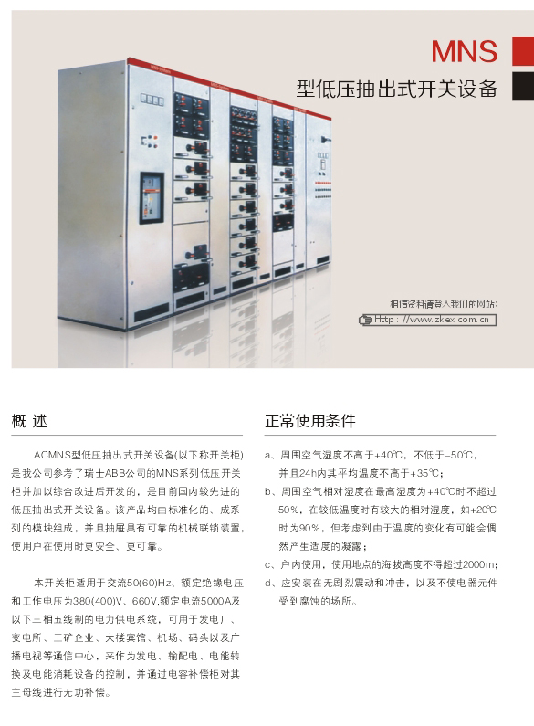 ACMNS型低壓抽出式開關(guān)設(shè)備(以下稱開關(guān)柜) 是我公司參考了瑞士ABB公司的MNS系列低壓開關(guān) 柜并加以綜合改進(jìn)后開發(fā)的,是目前國內(nèi)較新型的 低壓抽出式開關(guān)設(shè)備。該產(chǎn)品均由標(biāo)準(zhǔn)化的、成系 列的模塊組成,并且抽屜具有可靠的機(jī)械聯(lián)鎖裝置, 使用戶在使用時(shí)更安全、更可靠。
