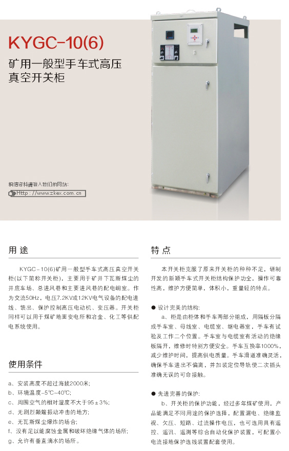 KYGC- 10(6)礦用-般型手車式高壓真空開關(guān)柜(以下簡稱開關(guān)柜),主要用于礦井下瓦斯煤塵的井底車場、總進(jìn)風(fēng)巷和主要進(jìn)風(fēng)巷的配電峒室。作為交流50Hz,電壓7.2KV或12KV電氣設(shè)備的配電進(jìn)線、饋出、保護(hù)控制高壓電動機(jī)、變壓器。開關(guān)柜同樣可以用于煤礦地面變電所和冶金、化工等供配.電系統(tǒng)使用。