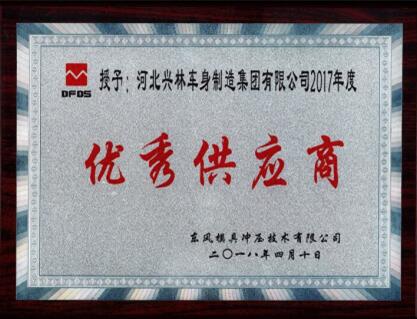 2018年4月10日在東風模具沖壓技術(shù)有限公司2018年供應(yīng)商大會上,河北興林車身制造集團有限公司憑借產(chǎn)品質(zhì)量過硬、交貨迅速及時、服務(wù)細致周到,被東風模具沖壓技術(shù)有限公司授予2017年度“優(yōu)秀供應(yīng)商”榮譽稱號。