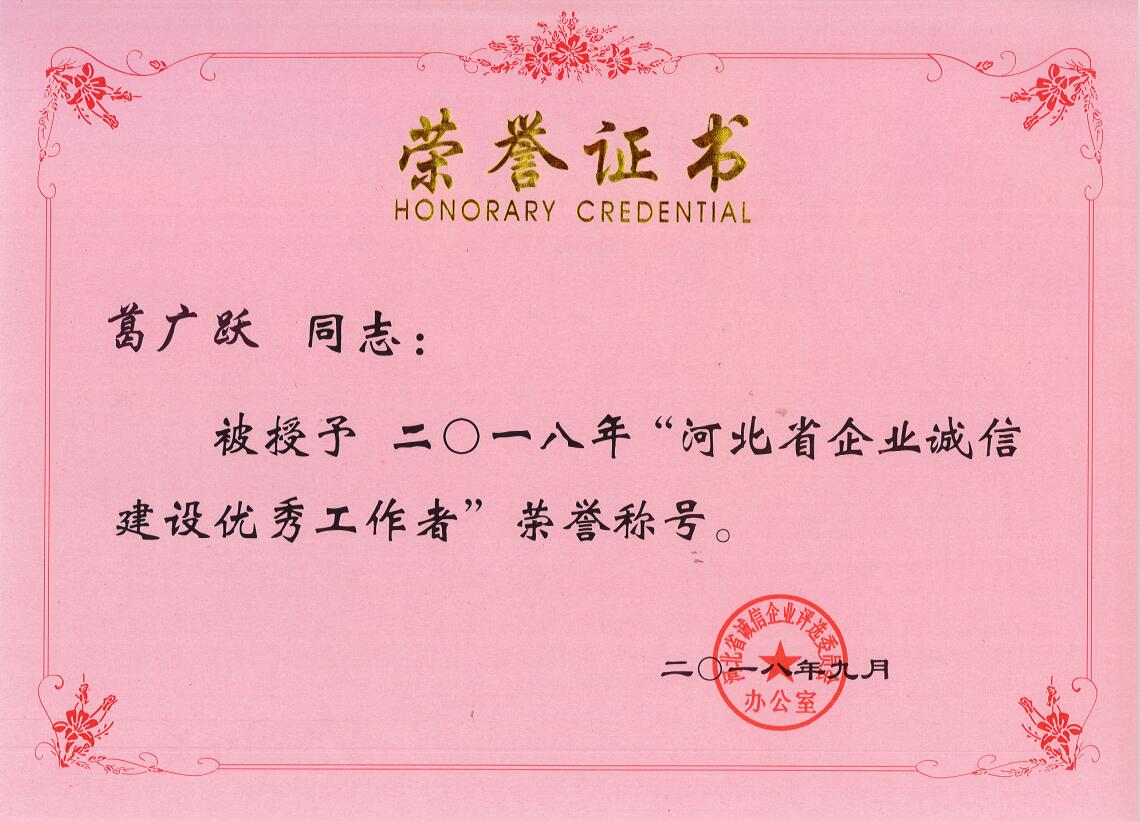 我司憑借良好的誠信建設和社會信譽,以誠信提升業務水平,進行誠信經營管理,以質量求生存,積極加強誠信管理。榮獲“河北省誠信企業”榮譽稱號,總經理葛廣躍先生榮獲“河北省誠信企業建設優秀工作者”稱號。
